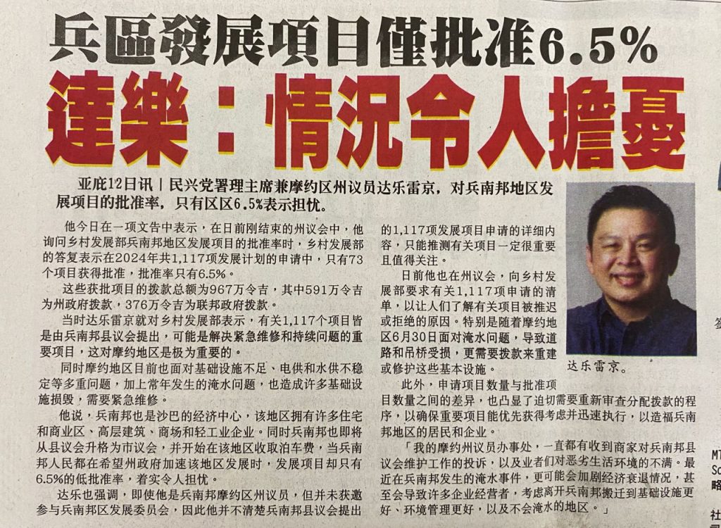 In the recent session of the Dewan Undangan Negeri, Darell Leiking, the State Assemblyman for Moyog, expressed his concern over the low rate of approvals for development projects in Penampang when the Rural Development Ministry of Sabah replied that only 6.5% of projects applied for were approved.