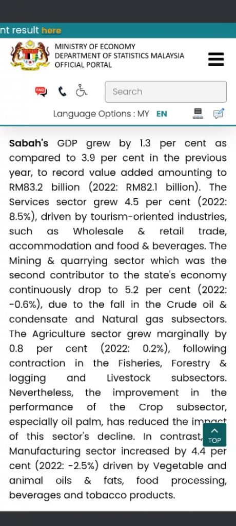 Sebagai permulaan, saya ingin meminta kepastian daripada Ketua Menteri samada jumlah RM83.2 billion itu tepat ataupun tidak. Ini adalah kerana menurut Laporan Tahunan KDNK Mengikut Negeri yang diterbitkan oleh Jabatan Statistik Malaysia (DOSM) tahun lalu, Sabah telah merekodkan KDNK sebanyak RM82.1 billion untuk 2022 manakala untuk 2023, KDNK negeri ini ialah RM83.2 billion.